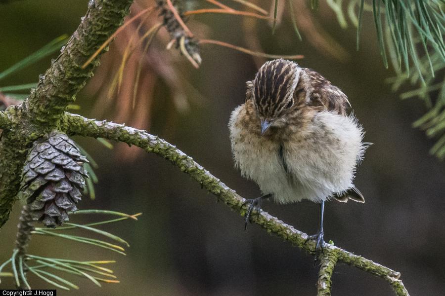 Whinchat - 1 - male in suitable breeding habitat ; Curlew - 1 - alarming - presumably young present ; Whitethroat - 1 - singing ; Meadow Pipit - 11 ; Skylark - 2 ; Sparrowhawk - 1 - male carrying prey into wood