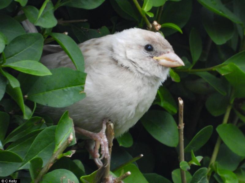 House Sparrow - 12+ - Leucistic fledgling amongst garden residents