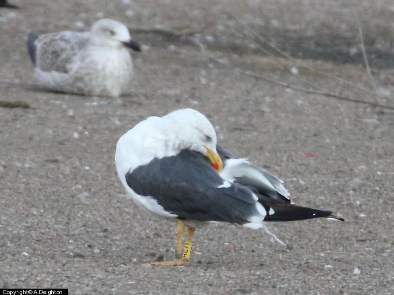 - 1 - 1w again 18:15-19:00 with loafing Gulls ; Lesser Black-backed Gull - c250 - including a colour ringed ad ringed Helgoland in 2010, and present here in Sept for it's 3rd successive year, and a new Belgian ringed bird. ; Great Black-backed Gull - 4 - adults ; Herring Gull - c15 ; Little Egret - 2 - in trees upstream at lunchtime. ; Cormorant - 3 - headed W, 2 U-turned back E ; 319 - 1