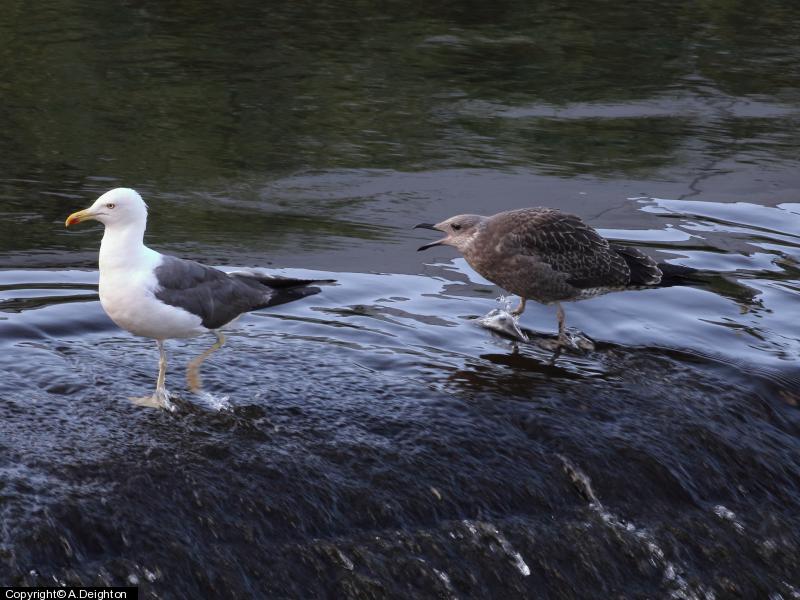 Lesser Black-backed Gull - c50 - with the 2 fresh juvs on the weir tonight, one begging from an adult, good evidence of local breeding