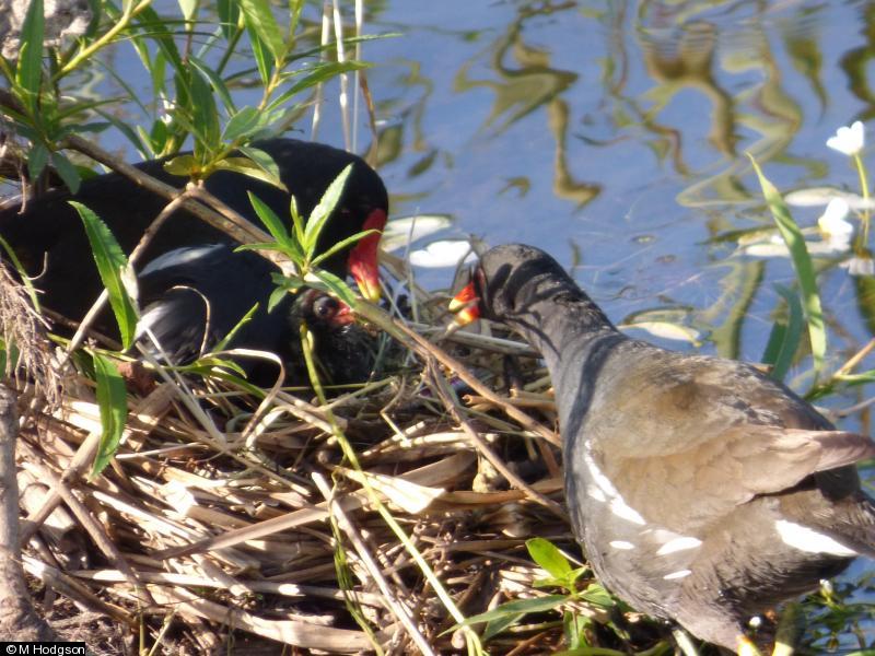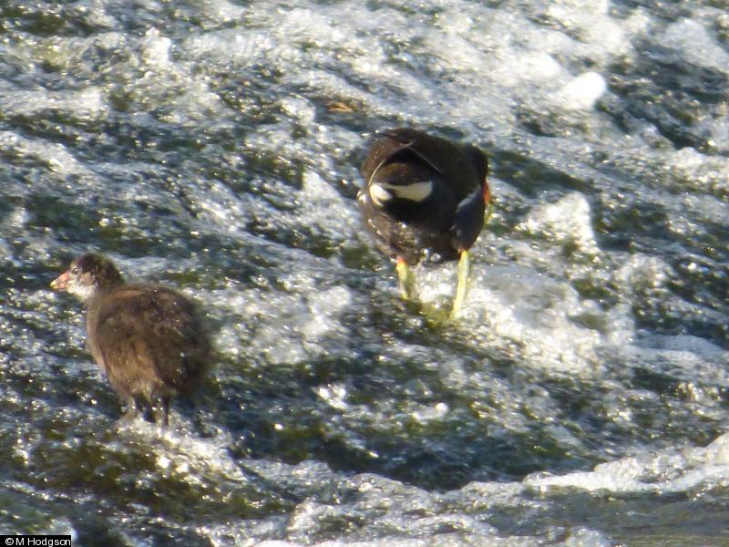 Swift - 1 - with sand martins ; Sand Martin - 5 - max, mostly 1 ; Moorhen - 7 - 1 ad feeding juv on weir ; Moorhen - 7 - 2 ad with 3(?) young in nest