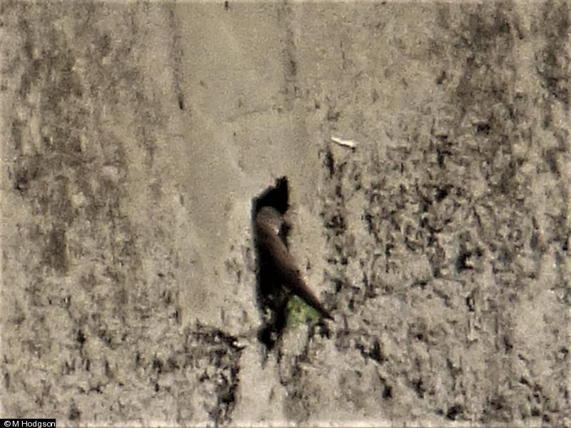 Kingfisher - 3 - 2 ad feeding 1 juv ; Sand Martin - 10+ - 3 nesting holes in use N of bridge + some fluttering flight of young. Record shot ; Sand Martin - 10+ - young at nest entrance