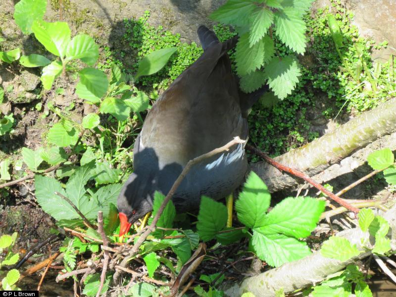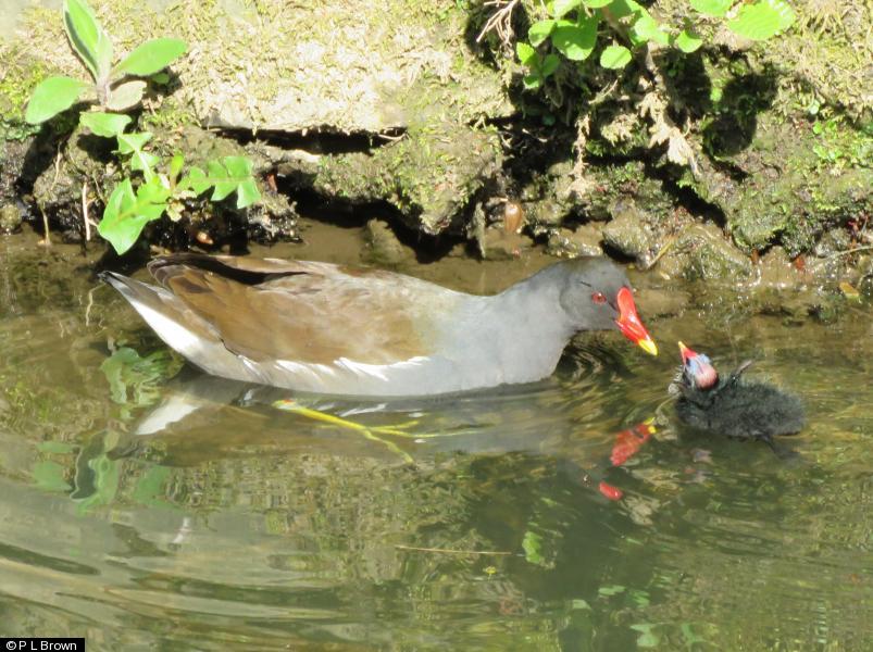 Moorhen - 5 - Adult feeding three small young while other adult builds a new nest perilously close to the water's edge. ; Moorhen - 5 - Another picture