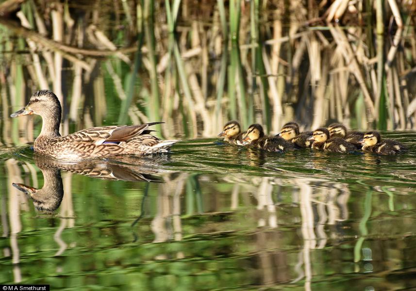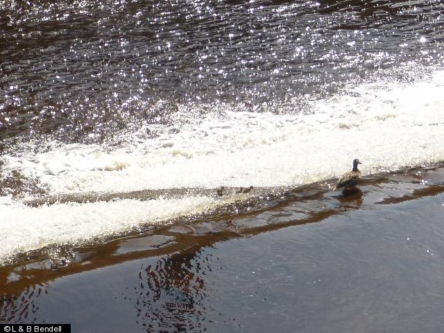 Mallard - 1 + 6 - Duck 'weir training' 6 ducklings at Hills' corner. All swam downstream as some ducklings caught in torrent.