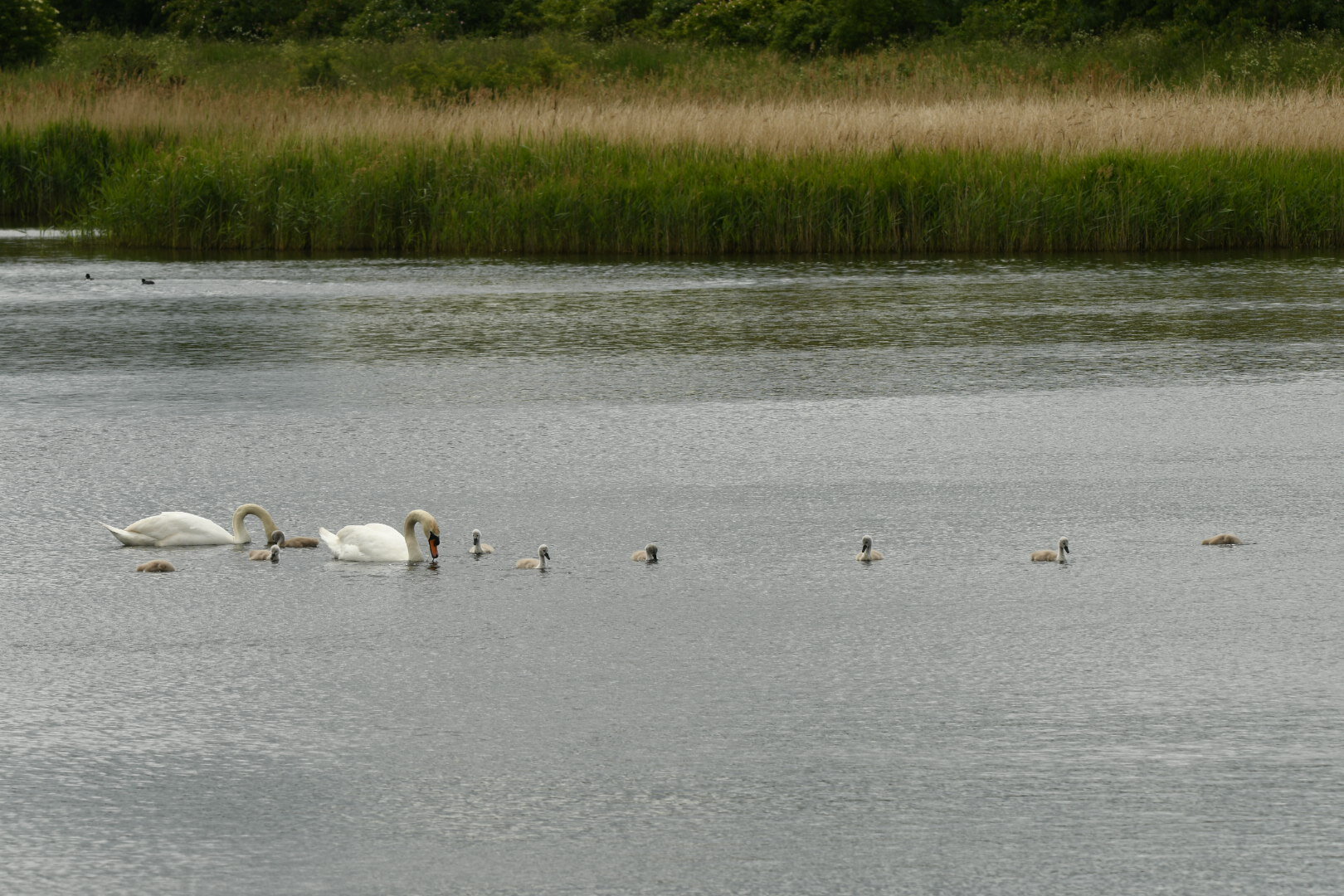 Mute Swan - 11 - Adult pair + 9 cygnets ; Little Grebe - 2 ; Tufted Duck - 2 ; Linnet - 3 ; House Martin - 15+ ; 319 - 1 ; Whitethroat - 5+ - 2 seen food carrying ; Swift - c10 ; Sand Martin - 1 ; Kestrel - 1 ;