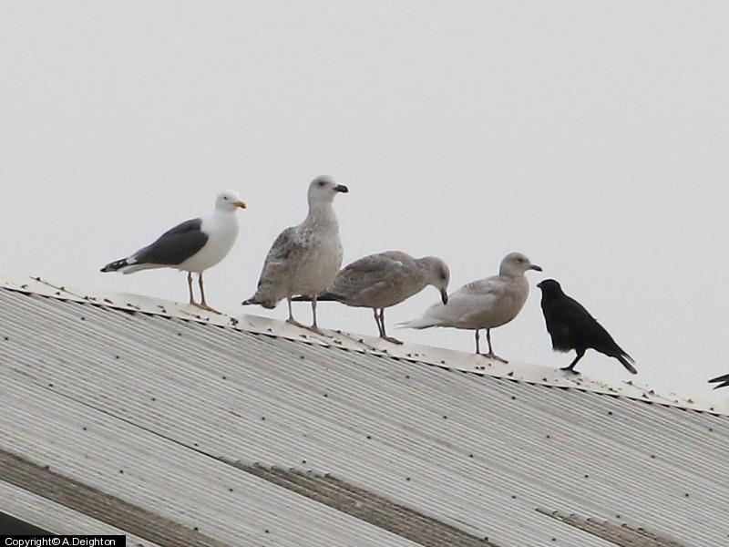 - 1 - 2cy on roof with other Gulls 09:05-09:15 ; Lesser Black-backed Gull - 6 - adults ; Great Black-backed Gull - 4