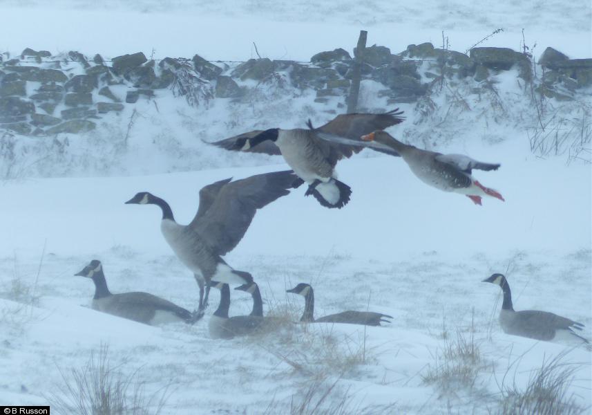 Lapwing - 8 - Blizzard conditions. Also Snipe. ; Greylag Goose - 12 - also Canada geese