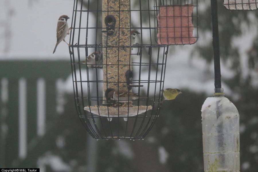 Song Thrush - 1 ; Siskin - 1 - on feeder ; Wren - 1 ; Great Spotted Woodpecker - 2 - Male and Female feeding on fat block at separate times ; Tree Sparrow - 6 ; Blackbird - 2 - both males ; House Sparrow - 3 - 2 male 1 female ; Starling - 4 - feeding ; Dunnock - 2 - feeding ; Robin - 2 ; Goldfinch - 2 - Feeding on birch seed ; Blue Tit - 2 ; Great Tit - 1 ; Jay - 1 ; Chaffinch - 3 - 2 Male 1Female ; Bullfinch - 1 - single male ; Magpie - 2 ; Long-tailed Tit - 2 ; Woodpigeon - 2 ; Feral Pigeon - 3 ; Fieldfare - 1 ; Carrion Crow - 2