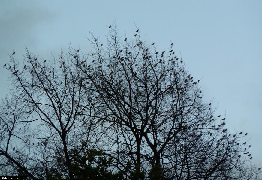 Goldfinch - 200+ - gathering noisily in treetops before dropping into laurels to roost @ 1605hrs