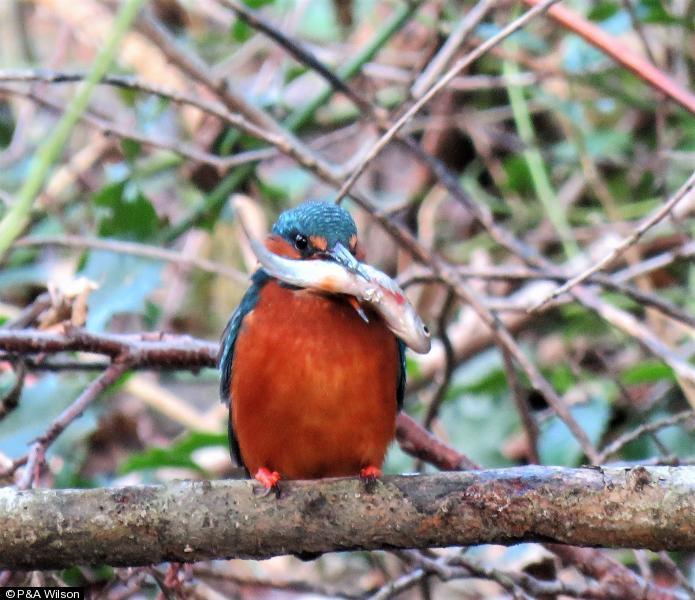 Kingfisher - 1 - Male caught, killed, but struggled to eat large fish ; Kingfisher - 1 - 2nd photo ; Grey Heron - 1 - in trees by dam
