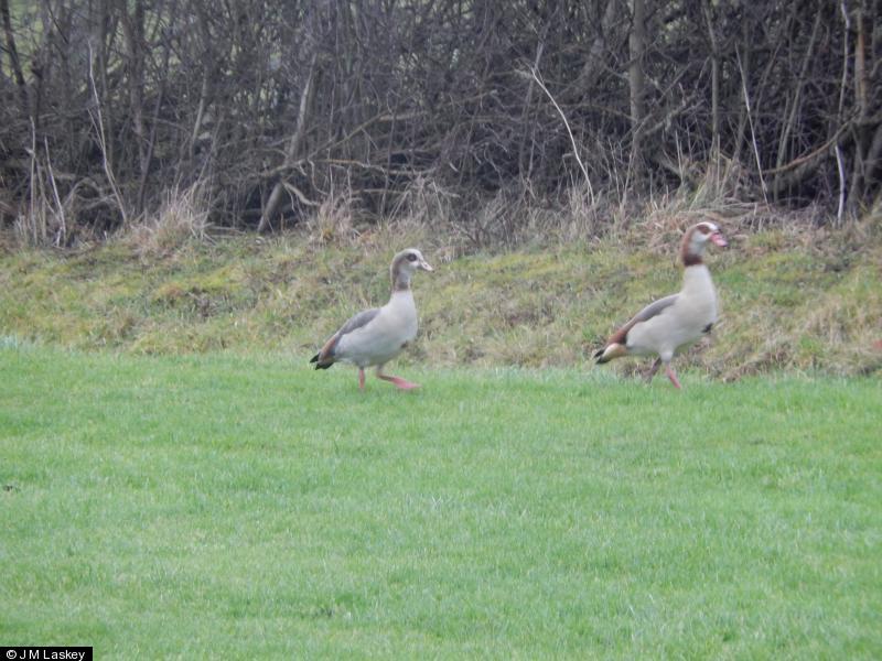 Little Egret - 1 - Flew across Nature Reserve lake ; Egyptian Goose - Pair - On grassland close to river. ;