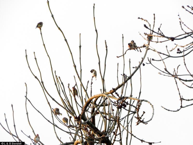 Goldfinch - c 25 - flock in ash and birch, feeding on natural plant seeds in gardens