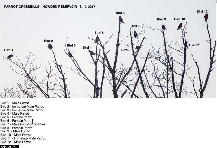 - 12 ; Crossbill - 5+ - Separate flock to the Parrots ; Siskin - 30+ ;