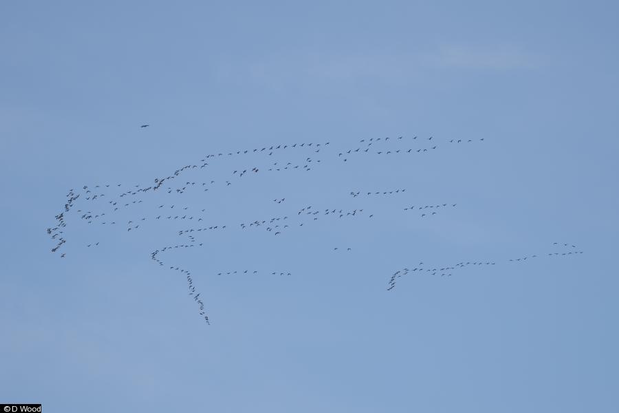 - 618 - SE in 2 skeins at 08:15 (counted from photos) - pic of most of one skein ; Golden Plover - c.80 - on S shore; small parties dropping in regularly ;