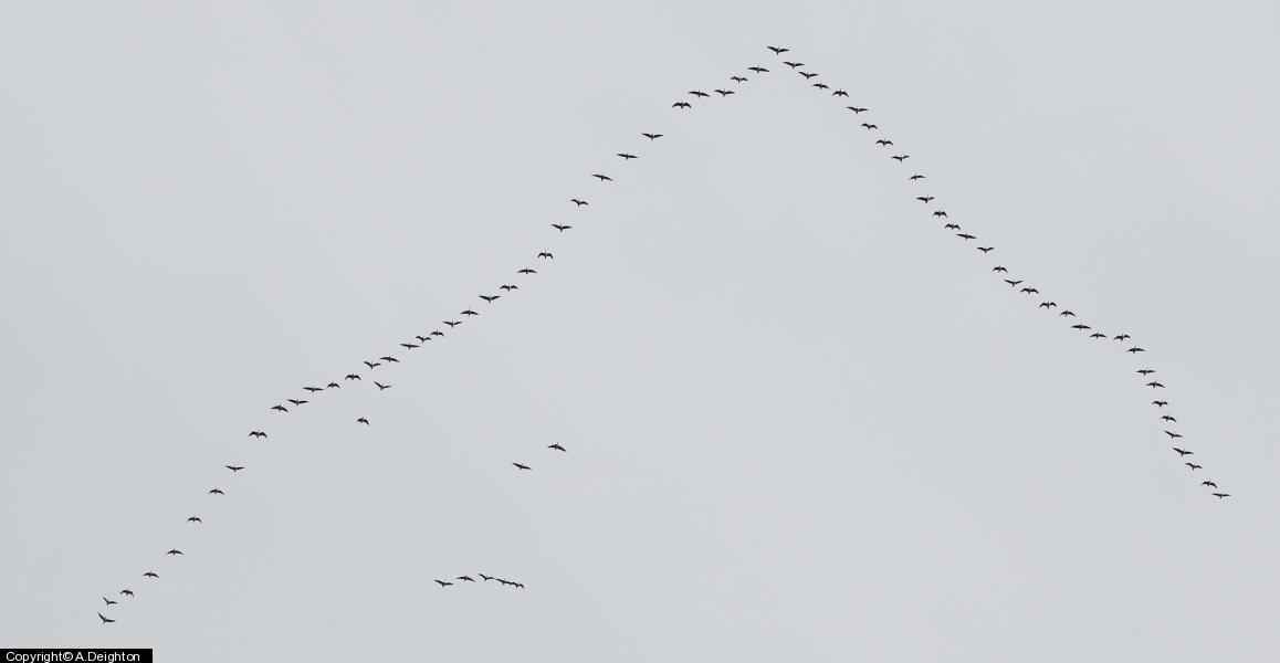 - 136 - Flock of 33 heading W then whiffling back E before joining larger group, all heading over W at 14:05.