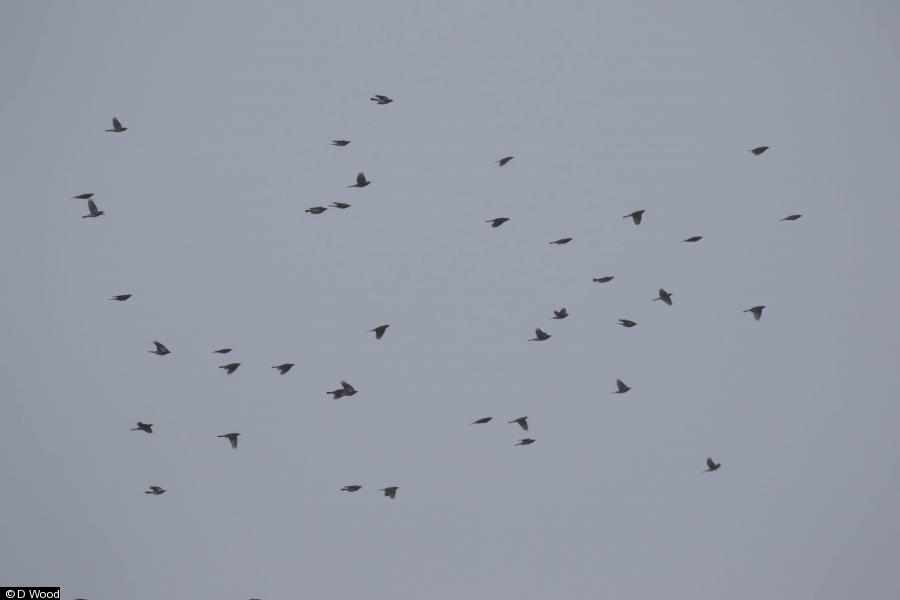 - 400 - W in small parties 07:30-10:30 ; Fieldfare - 450 - W in 3 hours - photo ; Starling - 240 - W in small parties prior to 10:30 ; Sparrowhawk - 1 - male dashed through low ; Kestrel - 1 ; Lapwing - 160 ; Golden Plover - 20 ; Great Spotted Woodpecker - 1 - presumed same bird W then back E ; Long-tailed Tit - 7 - flew between plantations ; Lesser Redpoll - 25 ; Siskin - 15