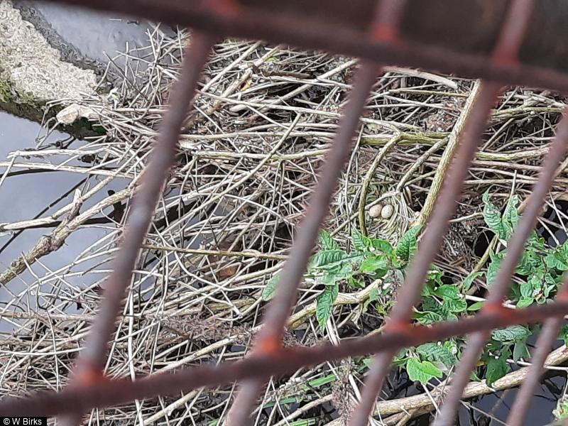 Sand Martin - 5+ - Entering at least three, possibly five, and probably more different nest holes in building foundations beside river. ; Moorhen - 6 - Pair with four chicks. As I arrived a parent and the four chicks left the nest leaving two eggs in the nest. Both parents then supervisd and fed the youngsters. ; 320 - 1 - lone male still present; one in same place last week