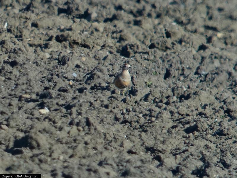 - 1 - adult presumed male in ploughed field at 17:15 ; Whinchat - 1 - feeding in ploughed field with Wheatears am ; Little Owl - 1 ; Tree Pipit - 1 - over calling am ; Grey Partridge - 4 - pair with two fully grown juvs ; Golden Plover - 16 - 1 juv