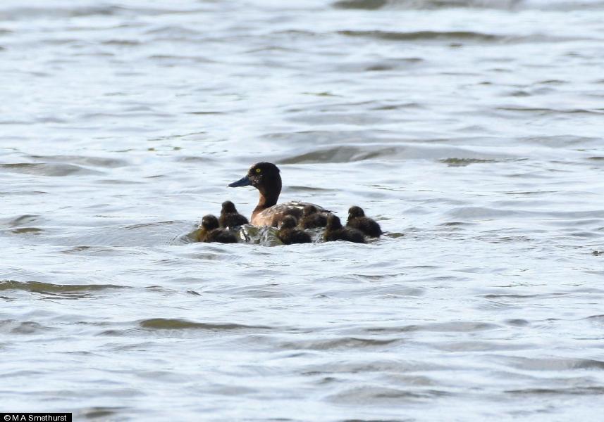Tufted Duck - c 100 - a female with six newly hatched young. ; Little Egret - 3 ; Common Sandpiper - 1 ; Little Egret - 3 - Mid-afternoon on small lake ; Common Sandpiper - 1 - On large lake ; Tufted Duck - 105 ; Little Grebe - 2 - One on large lake; imm on small lake ; Mute Swan - 13 - On large lake ; Canada Goose - 110 ; Greylag Goose - 90 - Including 2 Greylag-ish white birds ; Swift - 30