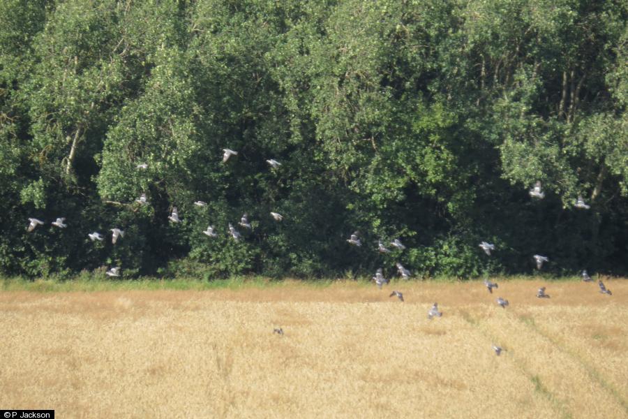 Woodpigeon - 60+ - Feeding in adjacent wheat field. ; Jay - 5 - Feeding with pigeons.