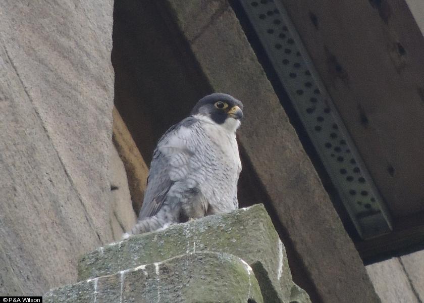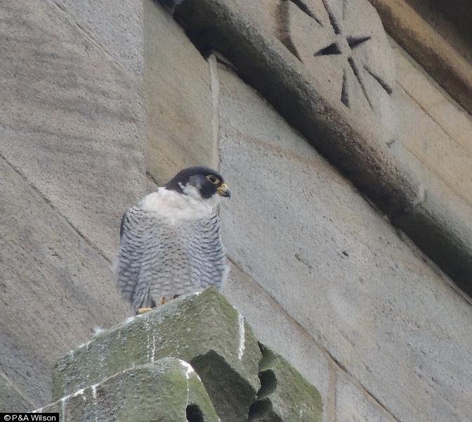 Peregrine - 4 - Adult & 3 Juveniles, climbing over the Church tower ; Peregrine - 4