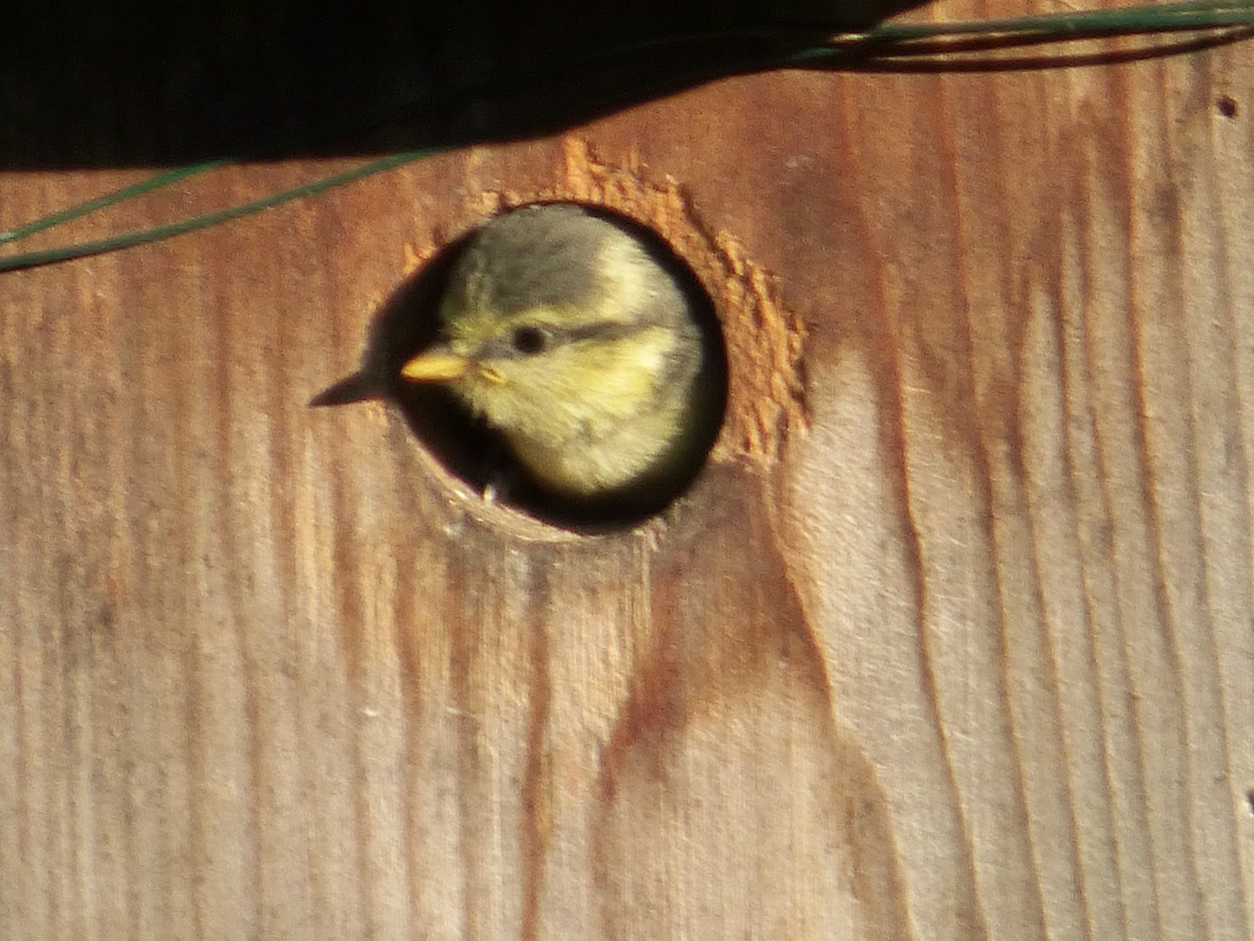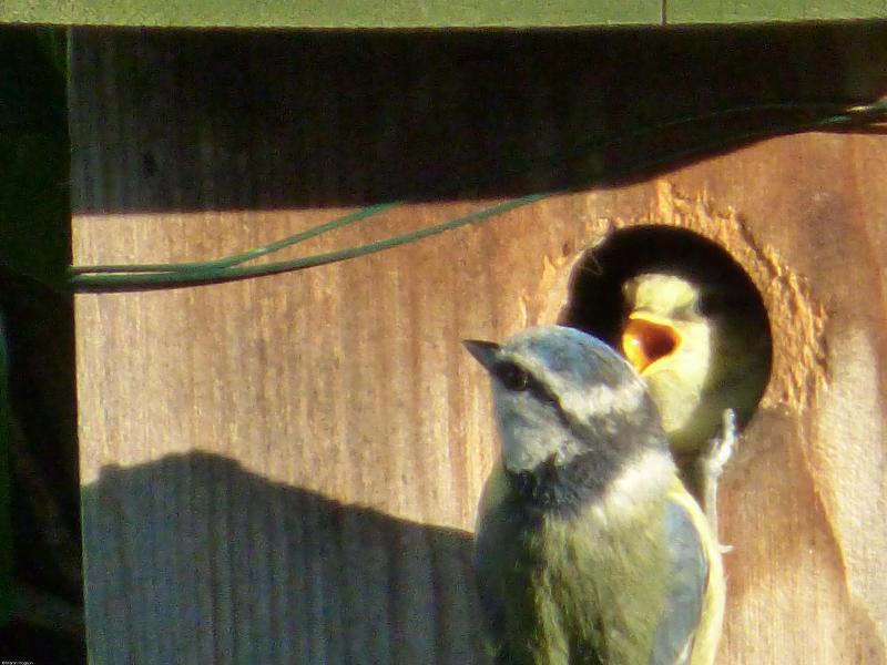 Blue Tit - 2+ - Photo 1: worn out parent ; Blue Tit - 2+ - 2: a peek into the future ; Blue Tit - 2+ - 3: encouragement ; Blue Tit - 2+ - 4: on the runway ... but no flight tonight