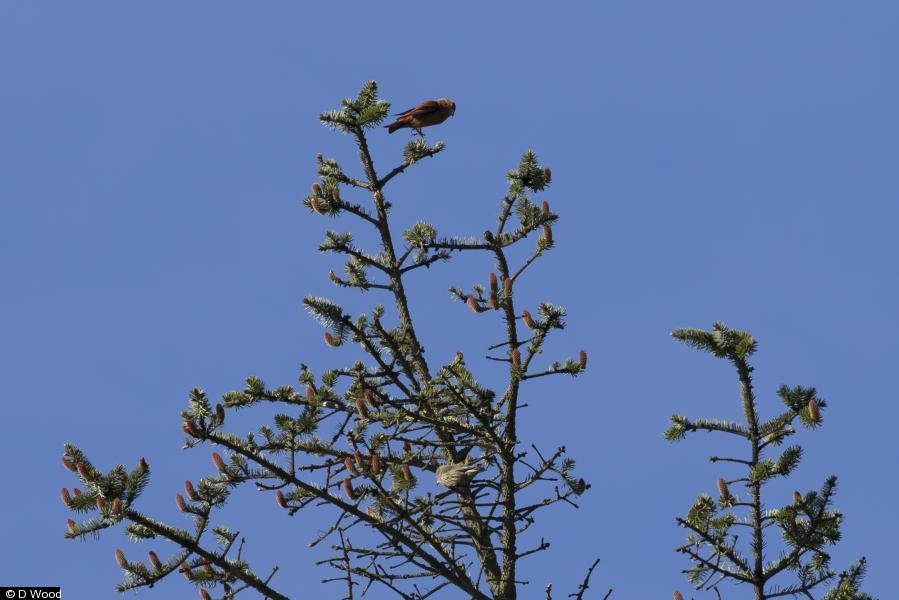 Crossbill - 1+ - calling ; Siskin - 5+ - 2 adults feeding at least 3 recently fledged young