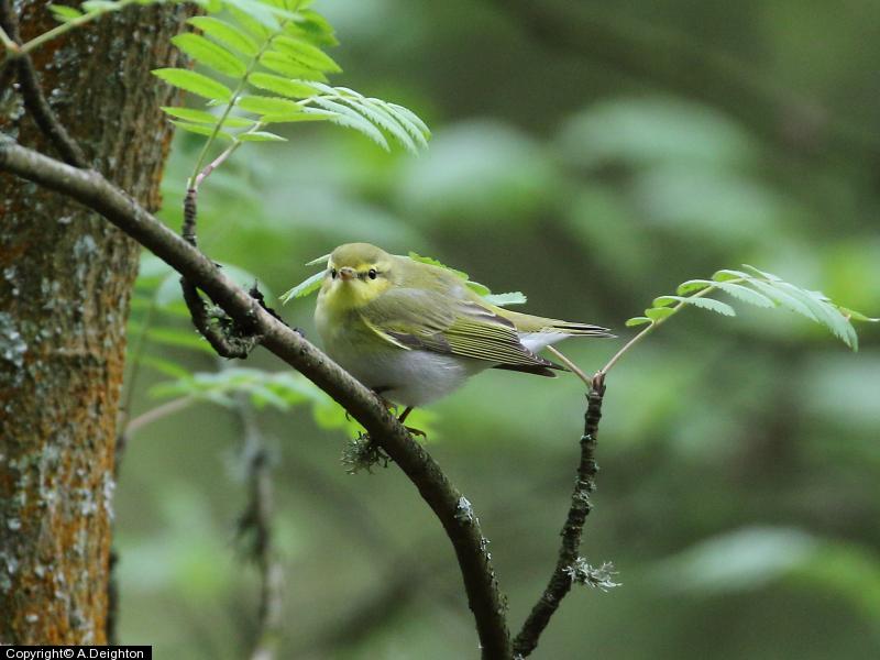 Spotted Flycatcher - 1 - Singing near plank gate ; Pied Flycatcher - 2 - Singing males ; Willow Warbler - 25+ ; Tree Pipit - 3+ ; Blue Tit - 20+ - 20 occupied nest boxes ; Great Tit - 20+ - 12 occupied nest boxes, pair in tree cavity ; Coal Tit - 5+ - 3 singing, 2 nests, one in nest box