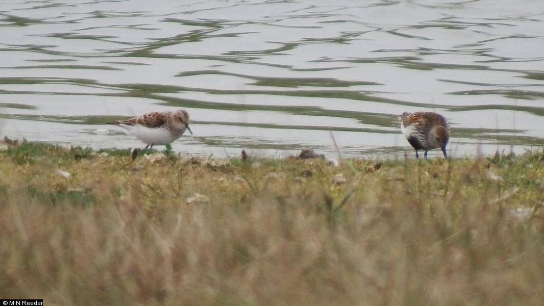 - 1 - on northern shoreline briefly at 06.50 then flew west ; Grasshopper Warbler - 1 - still reeling in Hollings Lane 'meadows'