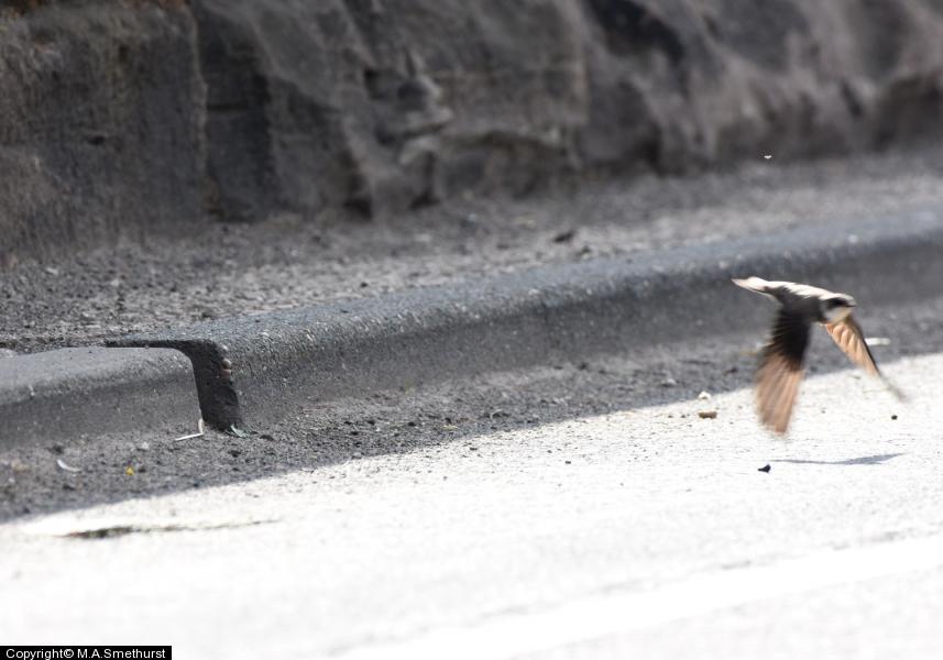 Sand Martin - 2 - carrying nesting material into old road drain pipes in road bridge before flying out through gap in kerb-stones on bridge.
