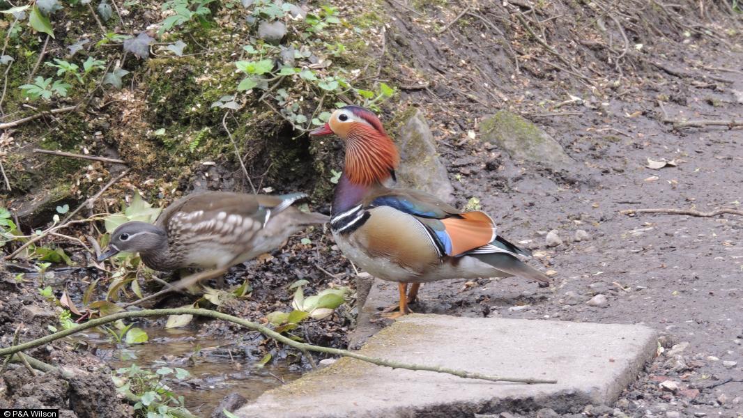 Pied Flycatcher - 5 - 3m, 2f including possible pair ; Nuthatch - 5 - including one using nest box ; Great Spotted Woodpecker - 1 - f ; Siskin - 2 - pair ; Grey Wagtail - 1 ; Mandarin - 1 - male on the ground in the woods