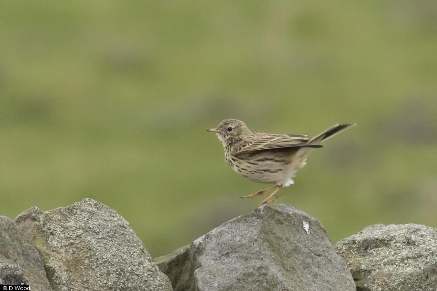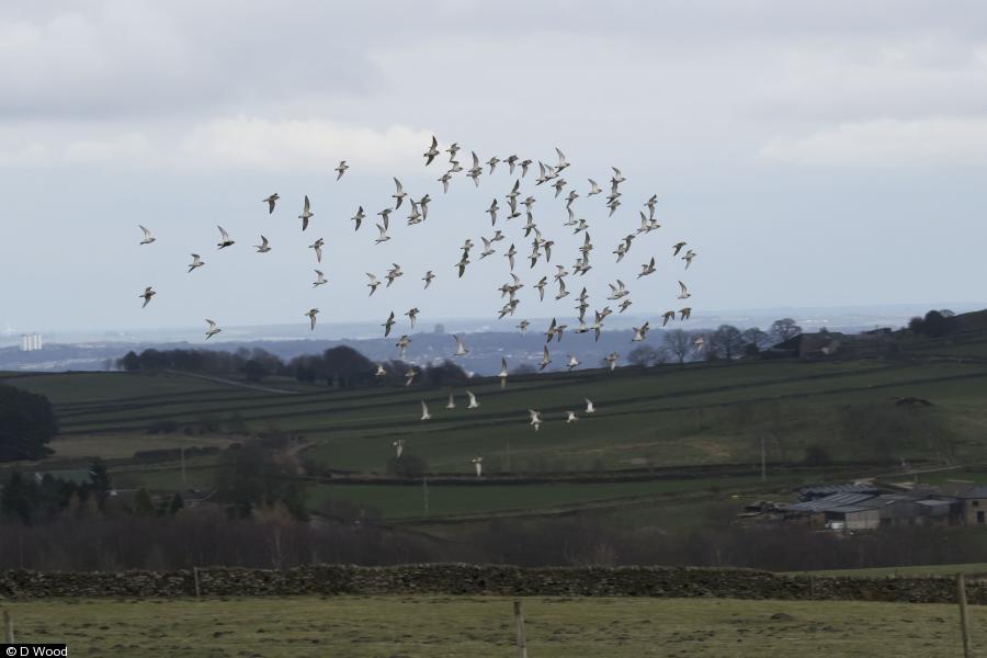 Wheatear - 1 - male ; Golden Plover - 180+ - at 17:30 ; Golden Plover - 598 - in rough field below conduit - photo of small group that circled briefly; my highest ever count here ; Lapwing - 40 - in rough fields - some display ; Meadow Pipit - 6 - apparently back on territory