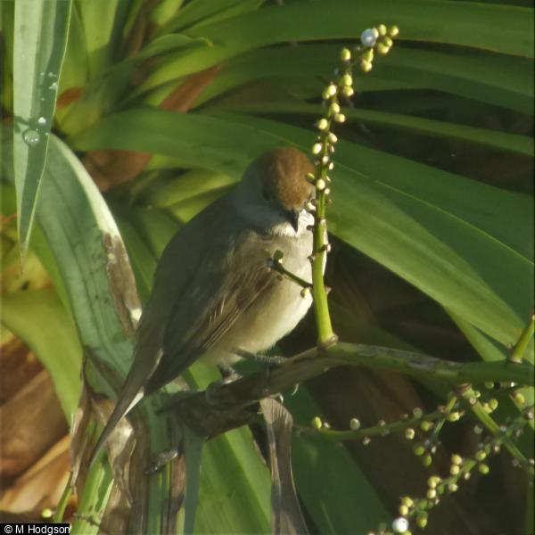 Blackcap - 1 - f, first of winter, commuting between pyracantha and ornamental date palm
