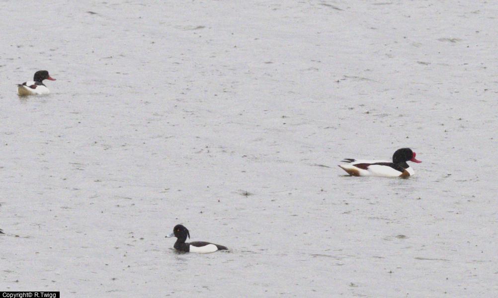 Shelduck - 2 - on big lake at 11.30 ; Sand Martin - 2 ; Willow Warbler - 1 - singing from trees alongside/N of railway bridge at 10.30 ; Shelduck - 2 - pair ; Wheatear - 2 ; Sand Martin - 3 ; Willow Warbler - 1 - singing between the bridges.