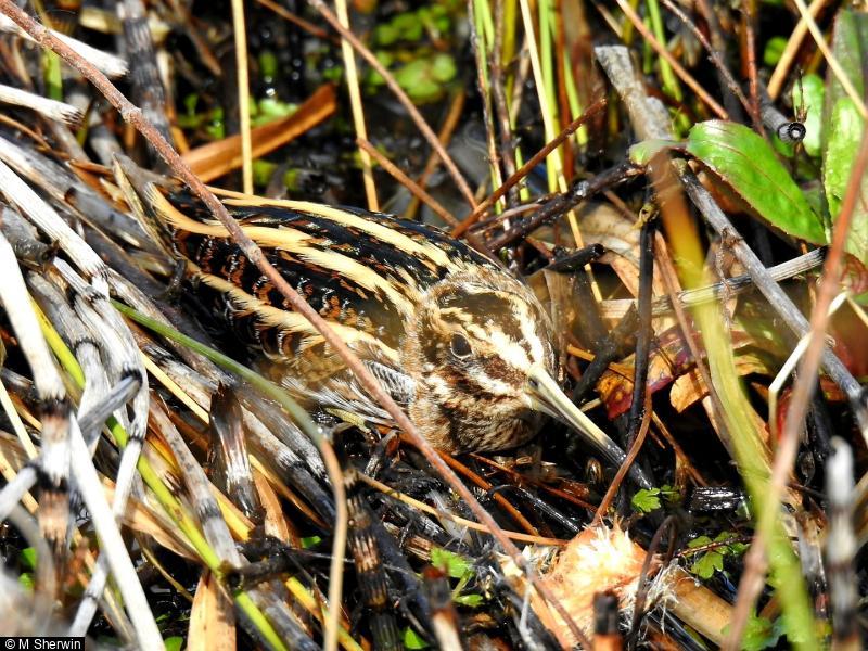 Mallard - 1 - female on nest with 9 eggs ; 320 - 4 - pair and two males ; Snipe - 72 - across the site ; Jack Snipe - 5 - across the site ; Jack Snipe - 5 - another photo ; Water Rail - 1 - calling