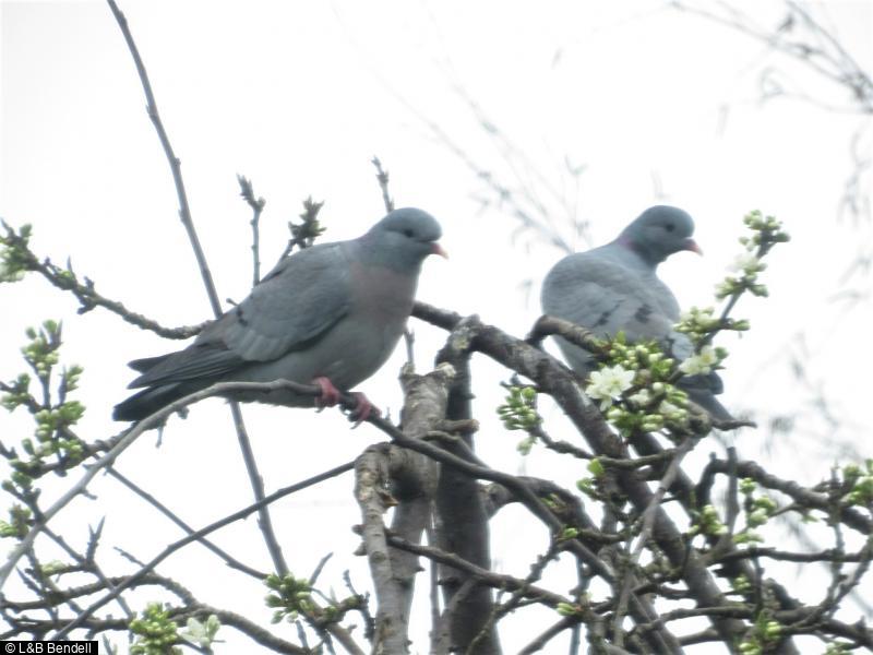 Stock Dove - 2 - Pair in fruit trees and under seed feeder
