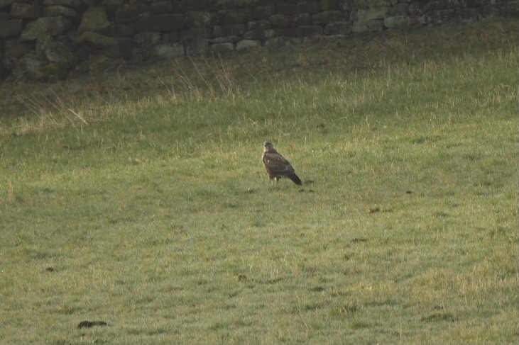 Kestrel - 1 - male, low across fields, causing blackbirds and tits to scatter along hedge.