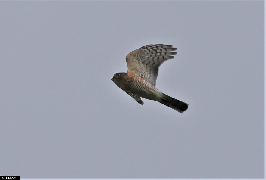 Wren - 1 ; Blackbird - 3 - feeding in horse field. ; Mistle Thrush - 1 ; Fieldfare - 39 - heading south. ; Merlin - 1 - sat on stone wall.