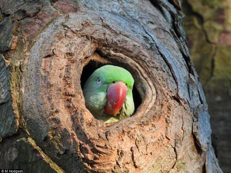 Ring-necked Parakeet - 3 - one in low nest-hole next to busy path. Another sitting just above