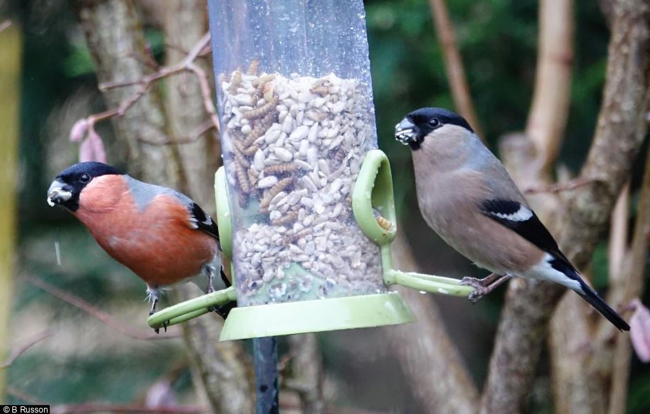 Bullfinch - 4 - Two pairs visiting feeders ; Siskin - 2 - Pair visiting feeders
