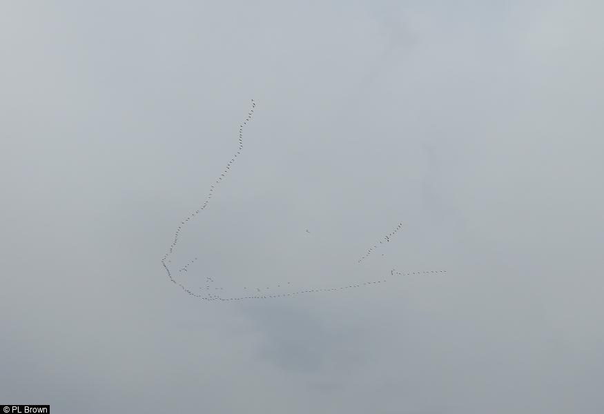 - 400 - c. flew low to the west in 3 skeins between 10:32 - 10:45 hrs ; 320 - 9 ; Mallard - 42 ; Kestrel - 2 ; Bullfinch - 1 ; Fieldfare - 20 - along conduit ; Curlew - 1 - the wintering bird flew E over Bottom Res 'bubbling' at 09:18hrs