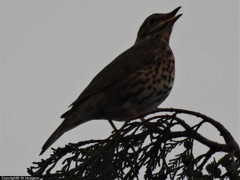 Song Thrush - 1 - singing, harassed by Blackbird ;