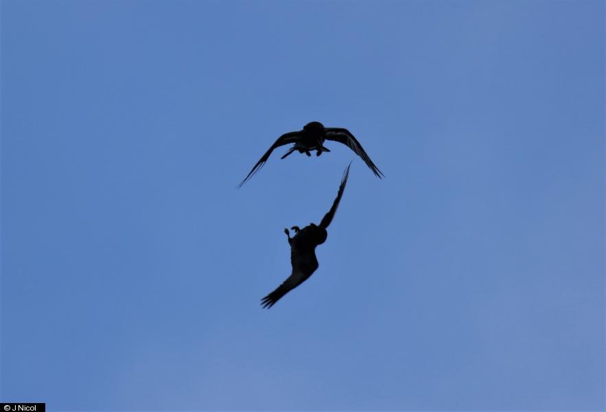 Raven - 1 - calling loudly over main lake whilst being mobbed by 6 carrion crows.