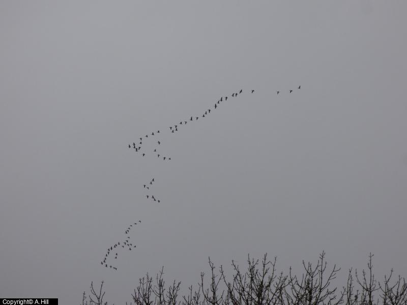 Canada Goose - 25 ; Greylag Goose - 20 ; Mallard - 8 ; Kestrel - 1 ; Lapwing - 25 - c. ; Lesser Black-backed Gull - 11 - flew SW ; Herring Gull - 1 - ad ; Black-headed Gull - 25 ; Common Gull - 17 - flew SW ; Woodpigeon - 200 - c. flew SW ; Fieldfare - 50 - c. flew SW ;