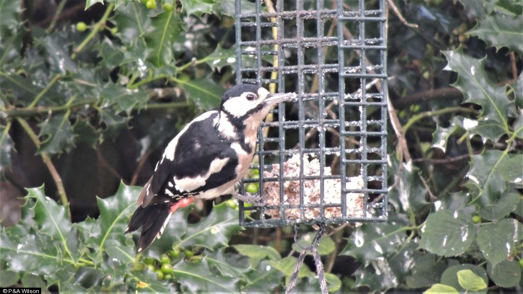 Swift - 1 - Over observer's garden ; Great Spotted Woodpecker - 1 - Female on feeder in observer's garden