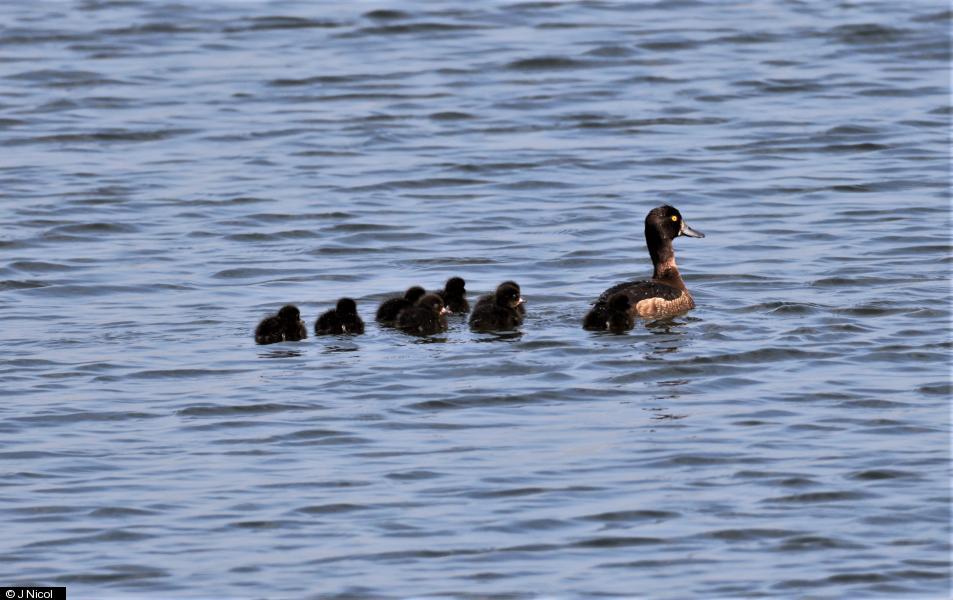 Little Ringed Plover - 3 - Juvs ; Goosander - 5 - Redheads ; Tufted Duck - 9 - Fem with 8 Ducklings. Subsequently reduced to 7 and still present 29th