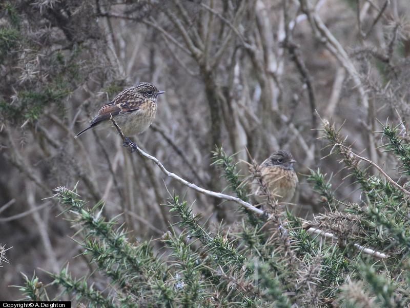 Stonechat - 3 - One adult and 2 juveniles in scrub away from woodland heading up to Stanage Pole