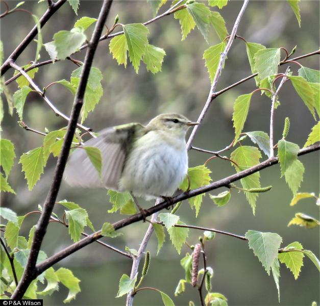 Swallow - 1 ; Pied Wagtail - 1 ; Willow Warbler - 4 - Singing ; Long-tailed Tit - 1 ; Blackcap - 1 - Male singing ; Goldcrest - 1 ; Garden Warbler - 1 - Singing ; Chiffchaff - 2 - Singing ; Song Thrush - 1 - Singing ; Willow Warbler - 4 - Couple in courtship & display