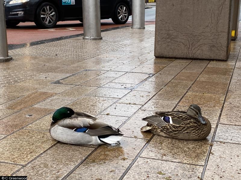 Greenfinch - 3+ - 2 males, one female in trees outside Manpower/Council building entrance. ; Mallard - 2 - Pair asleep on the pavement on The Moor