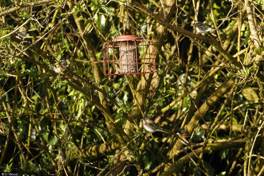 - 9+ - up to 7 at feeding station at any one time plus 2 heard singing nearby at the same time. All flew NNW around 09.45hrs